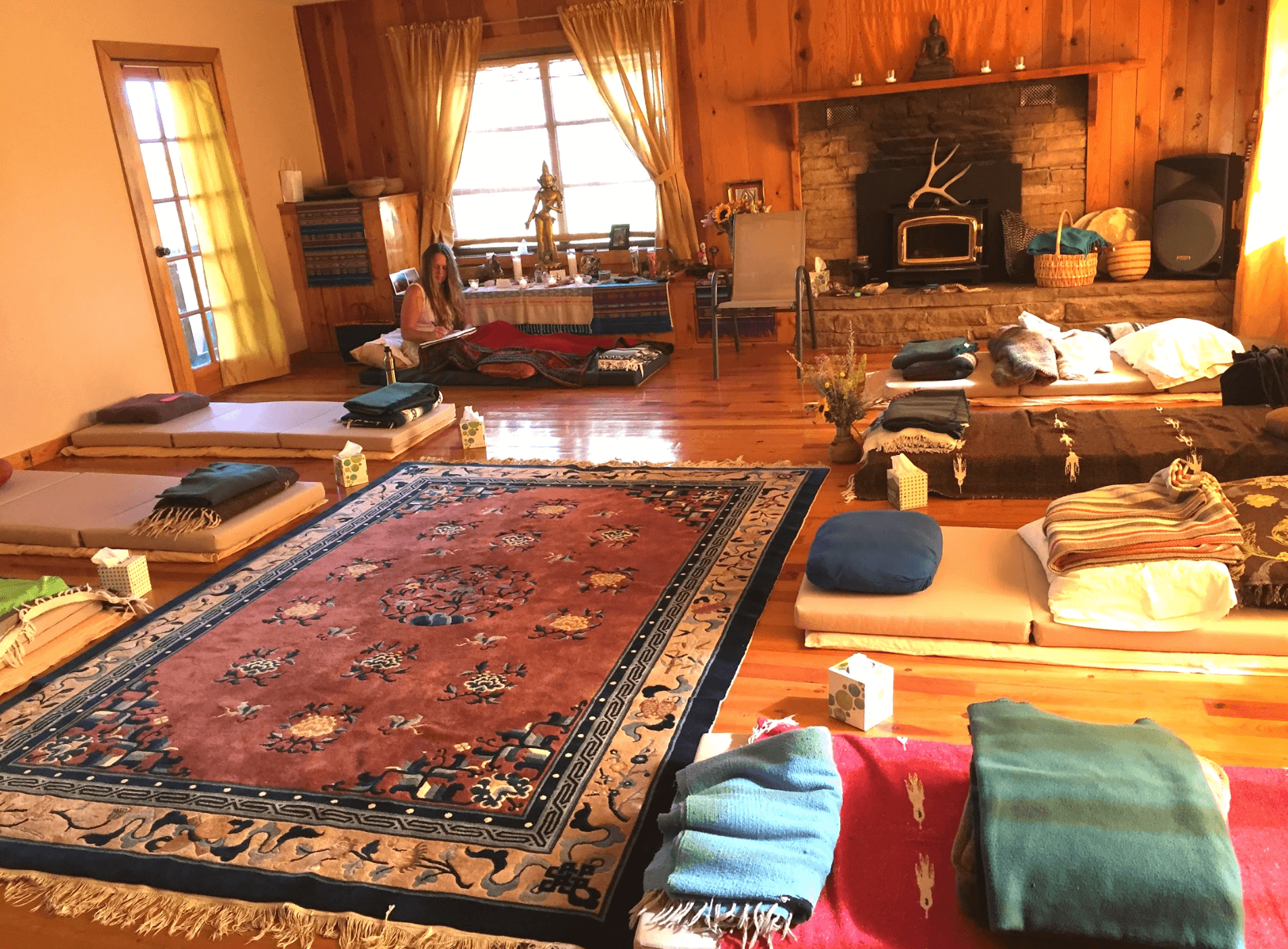 The Meditation Hall is appointed with a beautiful oriental carpet, yoga mats, zafus, backjacks, pillows and lightweight blankets. Lightweight chairs are available for those who need more support.